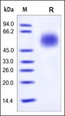 This protein carries a polyhistidine tag at the C-terminus. The protein has a calculated MW of 35.8 kDa. The protein migrates as 50-65 kDa under reducing (R) condition (SDS-PAGE) due to glycosylation.