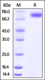 This protein carries a human IgG1 Fc tag at the C-terminus. The protein has a calculated MW of 61.7 kDa. The protein migrates as 70-90 kDa when calibrated against Star Ribbon Pre-stained Protein Marker under reducing (R) condition (SDS-PAGE) due to glycosylation.