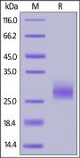 This protein carries a polyhistidine tag at the C-terminus. The protein has a calculated MW of 17.4 kDa. The protein migrates as 26-32 kDa under reducing (R) condition (SDS-PAGE) due to glycosylation.