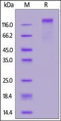 This protein carries a polyhistidine tag at the C-terminus, followed by an Avi tag (Avitag™). The protein has a calculated MW of 64.4 kDa. The protein migrates as 130-180 kDa when calibrated against Star Ribbon Pre-stained Protein Marker under reducing (R) condition (SDS-PAGE) due to glycosylation.