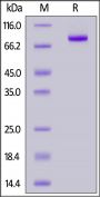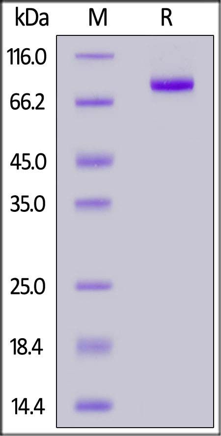This protein carries a human IgG1 Fc tag at the C-terminus, followed by an Avi tag (Avitag™). The protein has a calculated MW of 66.8 kDa. The protein migrates as 80-100 kDa under reducing (R) condition (SDS-PAGE) due to glycosylation.