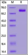 This protein carries a human IgG1 Fc tag at the C-terminus, followed by an Avi tag (Avitag™). The protein has a calculated MW of 63.5 kDa. The protein migrates as 80-106 kDa under reducing (R) condition (SDS-PAGE) due to glycosylation.