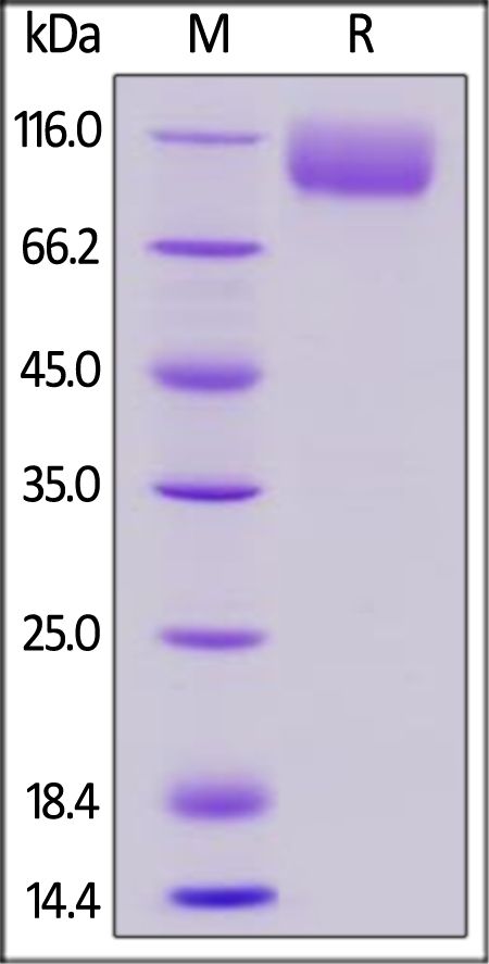 This protein carries a human IgG1 Fc tag at the C-terminus, followed by an Avi tag (Avitag™). The protein has a calculated MW of 63.5 kDa. The protein migrates as 90-120 kDa under reducing (R) condition (SDS-PAGE) due to glycosylation.