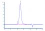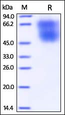This protein carries a polyhistidine tag at the C-terminus. The protein has a calculated MW of 27.3 kDa. The protein migrates as 40-60 kDa under reducing (R) condition (SDS-PAGE) due to glycosylation.
