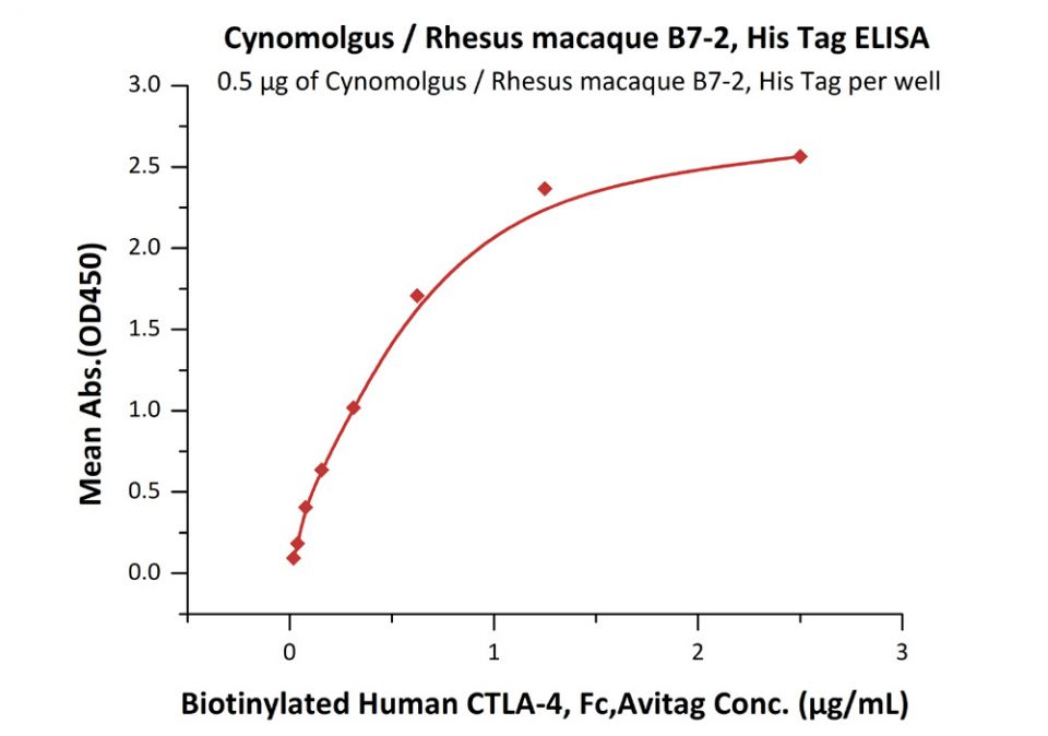 Cynomolgus / Rhesus macaque B7-2, His Tag (MALS verified) (CD6-C52H5) is expressed from human 293 cells (HEK293). It contains AA Ala 19 - His 240 (Accession # G7NXR4-1). In the region Ala 19 - His 240, the AA sequence of Cynomolgus and Rhesus macaque B7-2 are homologus.