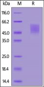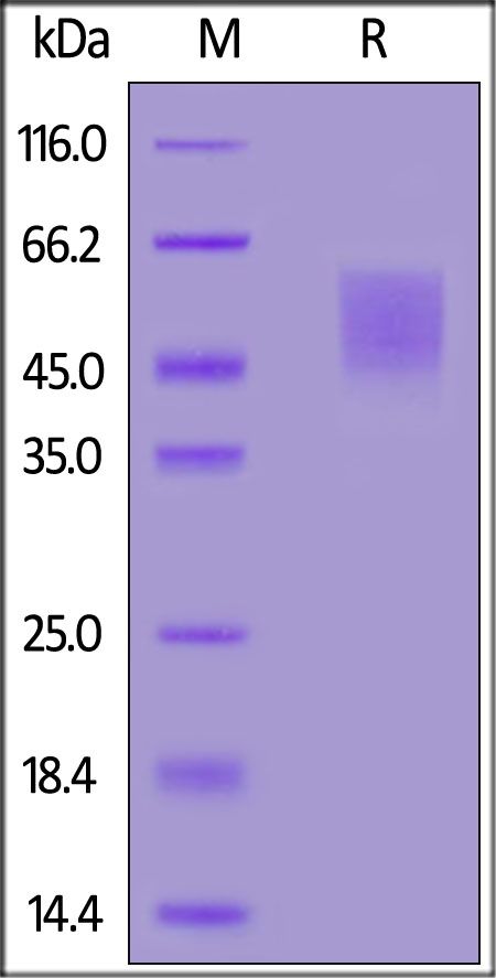 This protein carries a polyhistidine tag at the C-terminus. The protein has a calculated MW of 26.2 kDa. The protein migrates as 40-63 kDa when calibrated against Star Ribbon Pre-stained Protein Marker under reducing (R) condition (SDS-PAGE) due to glycosylation.