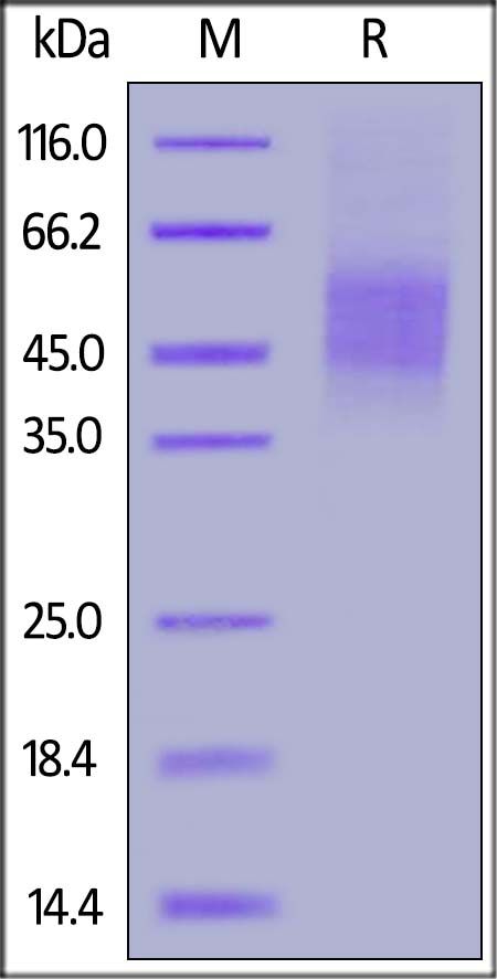 This protein carries a polyhistidine tag at the C-terminus. The protein has a calculated MW of 33.6 kDa. The protein migrates as 45-60 kDa when calibrated against Star Ribbon Pre-stained Protein Marker under reducing (R) condition (SDS-PAGE) due to glycosylation.