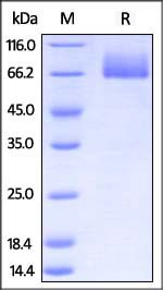 This protein carries a human IgG1 Fc tag at the C-terminus. The protein has a calculated MW of 51.9 kDa. The protein migrates as 66-80 kDa under reducing (R) condition (SDS-PAGE) due to glycosylation.