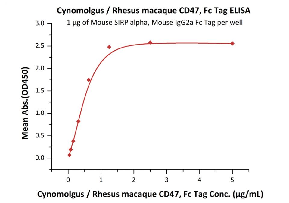 Cynomolgus / Rhesus macaque CD47, Fc Tag (CD7-C5252) is expressed from human 293 cells (HEK293). It contains AA Gln 19 - Glu 141 (Accession # F7A802-1). In the region Gln 19 - Glu 141, the AA sequence of Cynomolgus and Rhesus macaque CD47 are homologus.