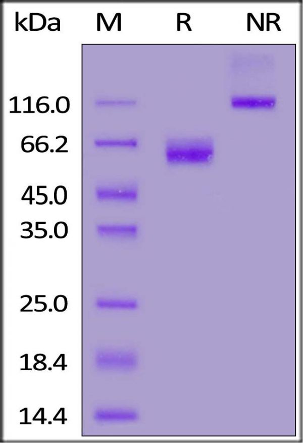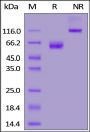 This protein carries a human IgG1 Fc tag at the C-terminus. The protein has a calculated MW of 40.5 kDa. The protein migrates as 55-66 kDa under reducing (R) condition, and 100-120 kDa under non-reducing (NR) condition (SDS-PAGE) due to glycosylation.