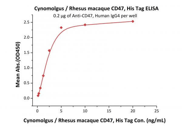 Cynomolgus / Rhesus macaque CD47, His Tag (CD7-C52H1) is expressed from human 293 cells (HEK293). It contains AA Gln 19 - Glu 141 (Accession # F7A802-1). In the region Gln 19 - Glu 141, the AA sequence of Cynomolgus and Rhesus macaque CD47 are homologus.