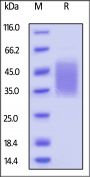This protein carries a polyhistidine tag at the C-terminus. The protein has a calculated MW of 15.8 kDa. The protein migrates as 30-50 kDa when calibrated against Star Ribbon Pre-stained Protein Marker under reducing (R) condition (SDS-PAGE) due to glycosylation.