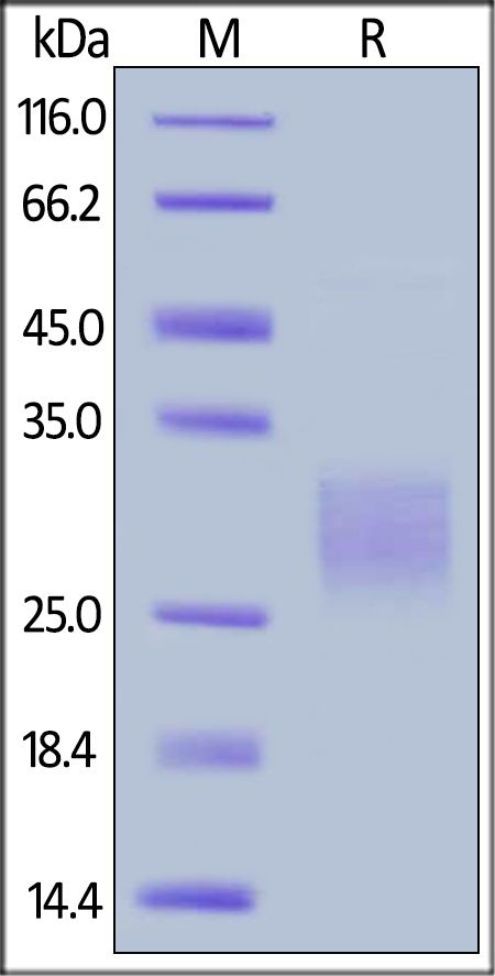 This protein carries a polyhistidine tag at the C-terminus. The protein has a calculated MW of 15.8 kDa. The protein migrates as 27-32 kDa under reducing (R) condition (SDS-PAGE) due to glycosylation.