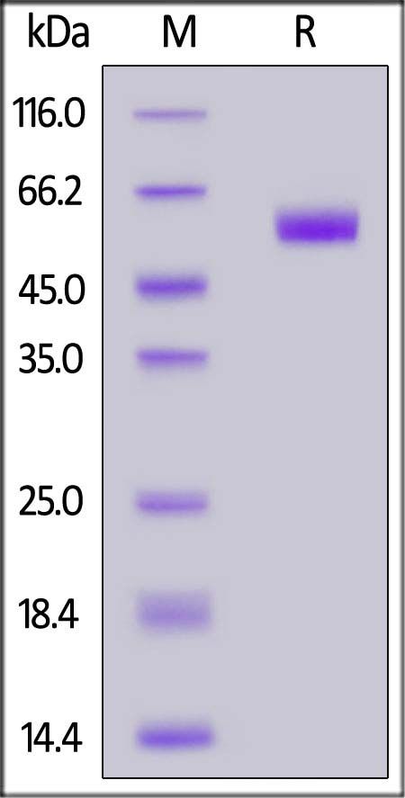 This protein carries a human IgG1 Fc tag at the C-terminus, followed by an Avi tag (Avitag™). The protein has a calculated MW of 44.6 kDa. The protein migrates as 55-65 kDa under reducing (R) condition (SDS-PAGE) due to glycosylation.