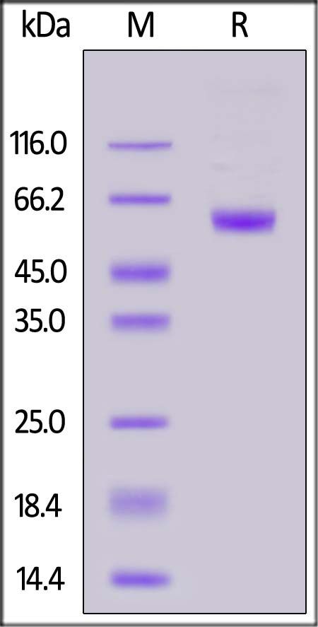 This protein carries a human IgG1 Fc tag at the C-terminus. The protein has a calculated MW of 42.9 kDa. The protein migrates as 60-65 kDa when calibrated against Star Ribbon Pre-stained Protein Marker under reducing (R) condition (SDS-PAGE) due to glycosylation.
