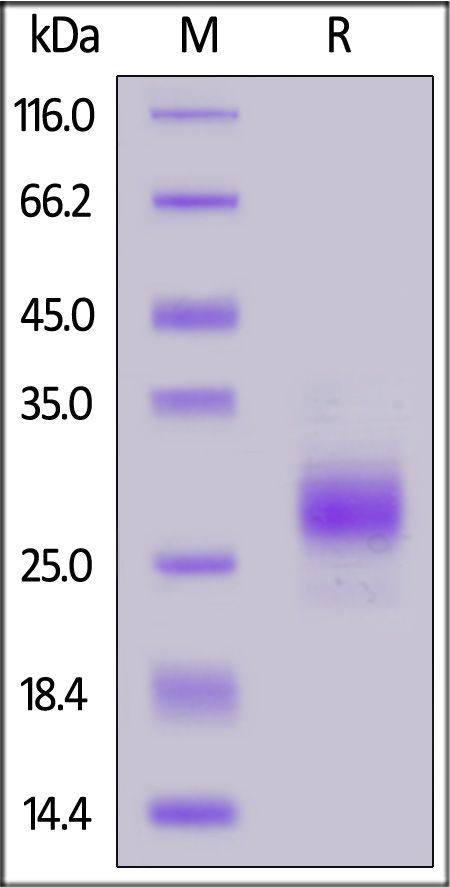 This protein carries a polyhistidine tag at the C-terminus. The protein has a calculated MW of 17.2 kDa. The protein migrates as 27-32 kDa when calibrated against Star Ribbon Pre-stained Protein Marker under reducing (R) condition (SDS-PAGE) due to glycosylation.
