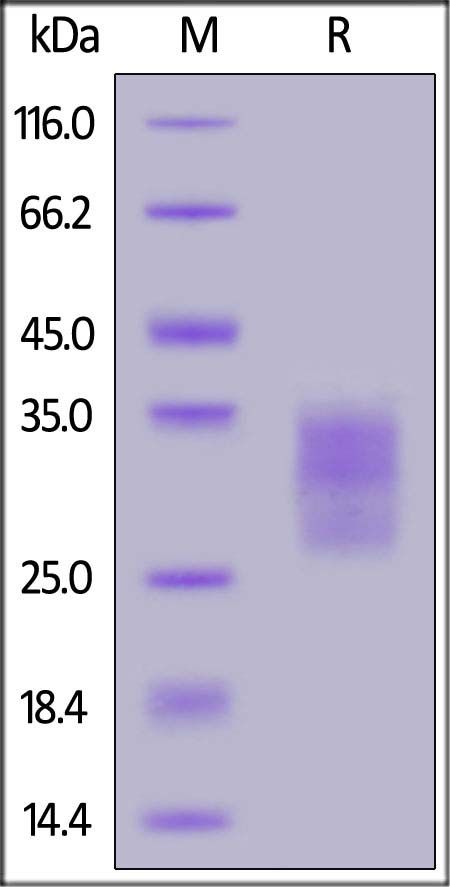 This protein carries a polyhistidine tag at the C-terminus. The protein has a calculated MW of 17.0 kDa. The protein migrates as 28-38 kDa under reducing (R) condition (SDS-PAGE) due to glycosylation.