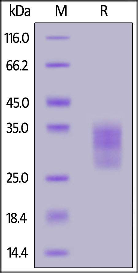 This protein carries a polyhistidine tag at the C-terminus. The protein has a calculated MW of 17.0 kDa. The protein migrates as 28-38 kDa under reducing (R) condition (SDS-PAGE) due to glycosylation.