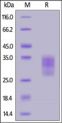 This protein carries a polyhistidine tag at the C-terminus. The protein has a calculated MW of 17.0 kDa. The protein migrates as 28-38 kDa under reducing (R) condition (SDS-PAGE) due to glycosylation.