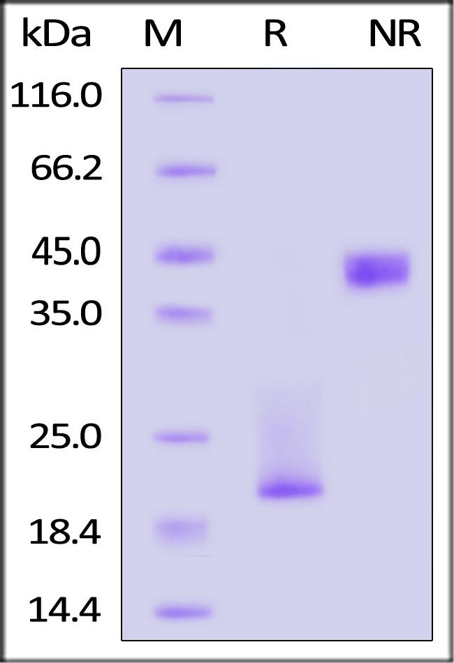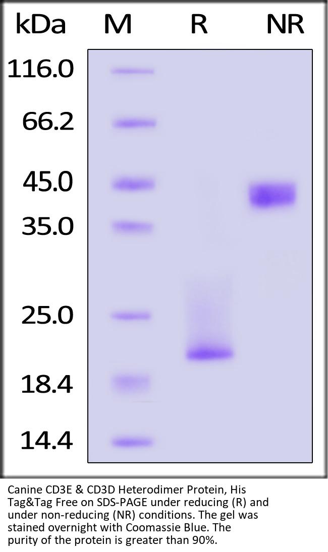 Canine CD3E & CD3D Heterodimer Protein, His Tag&Tag Free is produced by co-expression of CD3E and CD3D, has a calculated MW of 16.6 kDa (CD3E) and 13.3 kDa (CD3D). Subunit CD3E is fused with a polyhistidine tag at the C-terminus and subunit CD3D contains no tag. As a result of glycosylation, the heterodimer protein migrates as 19-20 kDa (CD3E) under reducing (R) condition, and 36-45 kDa (CD3D) under non-reducing (NR) condition (SDS-PAGE).