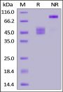 Human CD3E&CD3G Heterodimer Protein, Fc Tag&Fc Tag is produced by co-expression of CD3E and CD3G, has a calculated MW of 38.3 kDa (CD3E) and 36.9 kDa (CD3G). Subunit CD3E is fused with a human IgG1 Fc tag at the C-terminus and subunit CD3G is fused with a human IgG1 Fc tag at the C-terminus. As a result of glycosylation, the protein migrates as 43-55 kDa under reducing (R) condition, and 90-110 kDa when calibrated against Star Ribbon Pre-stained Protein Marker under non-reducing (NR) condition (SDS-PAGE).