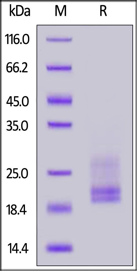 Human CD3E&CD3G Heterodimer Protein, His Tag&Tag Free is produced by co-expression of CD3E and CD3G, has a calculated MW of 16.9 kDa (CD3E) and 14.6 kDa (CD3G). Subunit CD3E is fused with a polyhistidine tag at the C-terminus and subunit CD3G contains no tag at the C-terminus. The reducing (R) heterodimer protein migrates as 19 kDa, 21 kDa and 26-27 kDa when calibrated against Star Ribbon Pre-stained Protein Marker due to glycosylation.