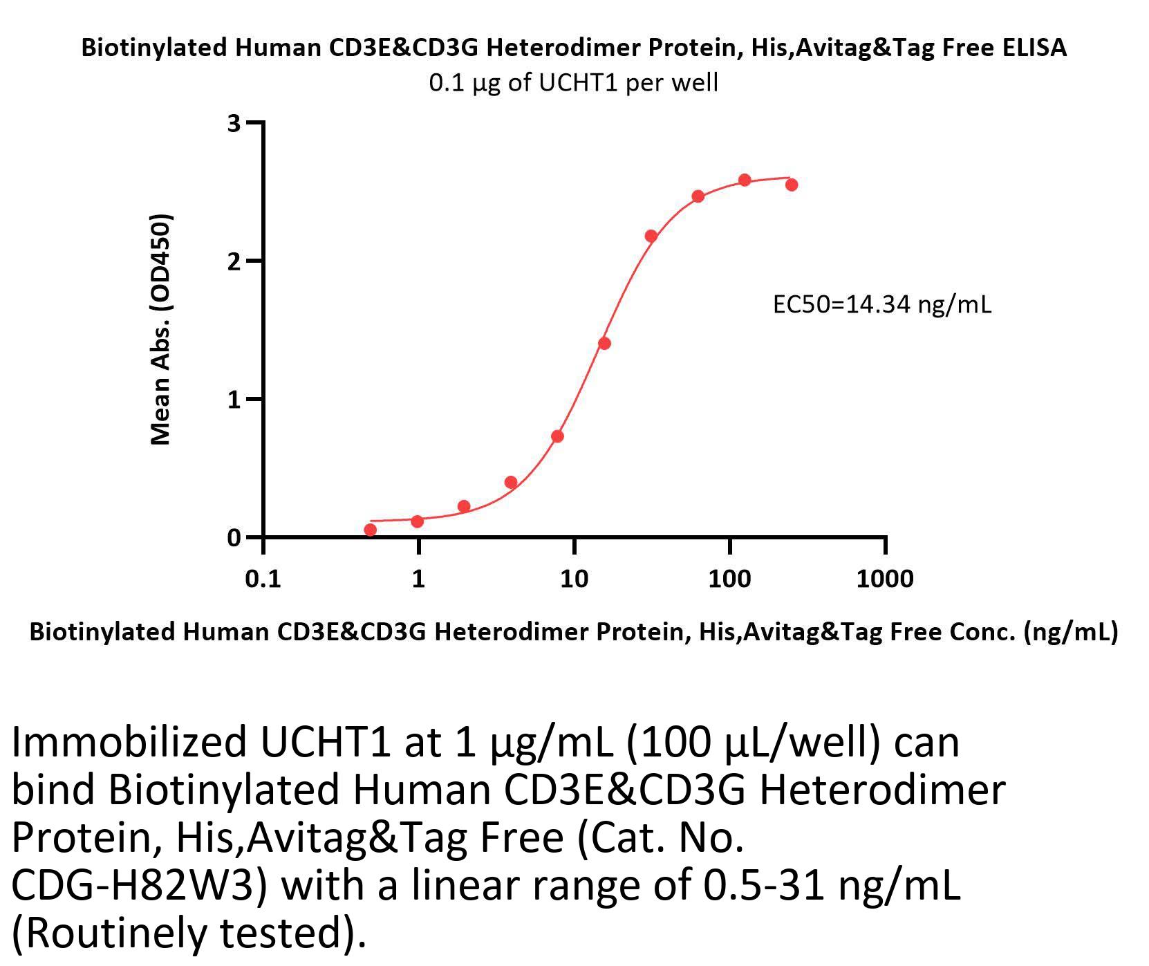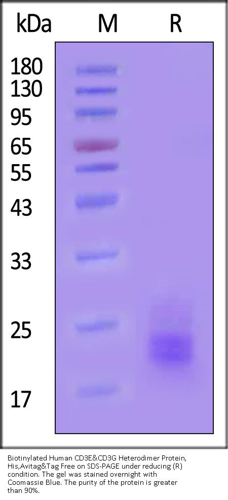 Biotinylated Human CD3E&CD3G Heterodimer Protein, His, Avitag&Tag Free is produced by co-expression of CD3E and CD3G, has a calculated MW of 18.6 kDa (CD3E) and 14.7 kDa (CD3G). Subunit CD3E is fused with a polyhistidine tag at the C-terminus, followed by an Avi tag and subunit CD3G contains no tag at the C-terminus. The reducing (R) heterodimer protein migrates as 20-24 kDa and 25-28 kDa when calibrated against Star Ribbon Pre-stained Protein Marker due to glycosylation.