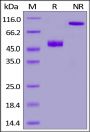 Mouse CD3E&CD3G Heterodimer Protein, Fc, His Tag&Fc, Flag Tag is produced by co-expression of CD3E and CD3G, has a calculated MW of 41.5 kDa (CD3E) and 41.6 kDa (CD3G). Subunit CD3E is fused with a human IgG1 Fc tag at the C-terminus, followed by a polyhistidine tag and subunit CD3G is fused with a human IgG1 Fc tag at the C-terminus, followed by a Flag tag. As a result of glycosylation, the protein migrates as 48-55 kDa under reducing (R) condition, and 100 kDa under non-reducing (NR) condition (SDS-PAGE).