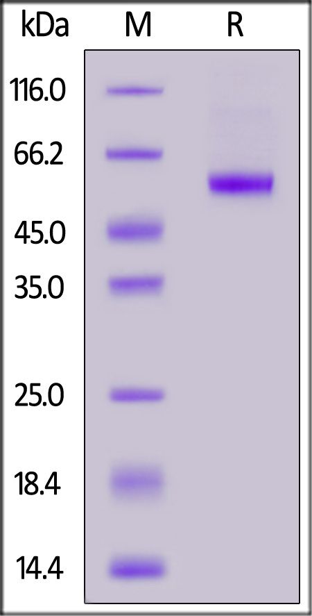 This protein carries an Avi tag (Avitag™) at the N-terminus, followed by flag tag. The polyhistidine tag is inserted in-between the Avi tag and Flag tag. The protein has a calculated MW of 51.6 kDa. The protein migrates as 50-55 kDa under reducing (R) condition (SDS-PAGE) due to glycosylation.