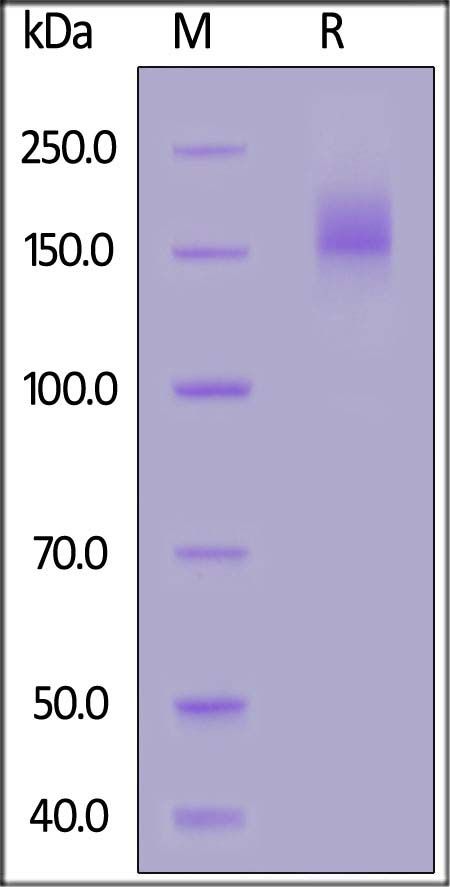 This protein carries a human IgG1 Fc tag at the C-terminus. The protein has a calculated MW of 97.8 kDa. The protein migrates as 150-180 kDa when calibrated against Star Ribbon Pre-stained Protein Marker under reducing (R) condition (SDS-PAGE) due to glycosylation.