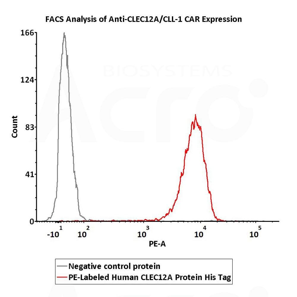 PE-Labeled Human CLEC12A, His Tag (CLA-HP2Q3) is produced via site-specific conjugation of PE to Human CLEC12A, His Tag under optimal conditions with a proprietary technology. Human CLEC12A, His Tag is expressed from human 293 cells (HEK293). It contains AA His 65 - Ala 265 (Accession # Q5QGZ9-2).