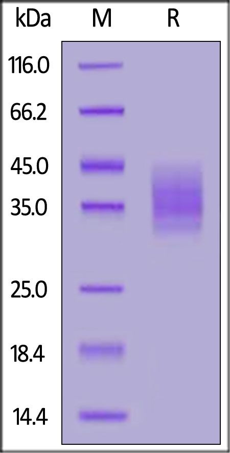 This protein carries a polyhistidine tag at the N-terminus. The protein has a calculated MW of 26.0 kDa. The protein migrates as 32-45 kDa under reducing (R) condition (SDS-PAGE) due to glycosylation.
