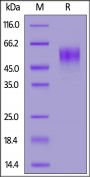 This protein carries a polyhistidine tag at the C-terminus. The protein has a calculated MW of 28.7 kDa. The protein migrates as 48-65 kDa under reducing (R) condition (SDS-PAGE) due to glycosylation.