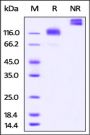 This protein carries a human IgG1 Fc tag at the C-terminus. The protein has a calculated MW of 81.9 kDa. The protein migrates as 110-125 kDa under reducing (R) condition, and 200- 240 kDa under non-reducing (NR) condition (SDS-PAGE) due to glycosylation.