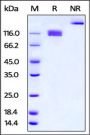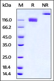 This protein carries a human IgG1 Fc tag at the C-terminus. The protein has a calculated MW of 81.8 kDa. The protein migrates as 100-130 kDa under reducing (R) condition, and 260 kDa when calibrated against Star Ribbon Pre-stained Protein Marker under non-reducing (NR) condition (SDS-PAGE) due to glycosylation.