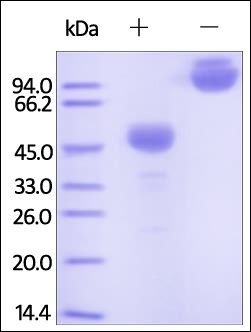 This protein carries a human IgG1 Fc tag at the C-terminus. The protein has a calculated MW of 39.9 kDa. The protein migrates as 42-50 kDa under reducing (R) condition, and 80-100 kDa under non-reducing (NR) condition (SDS-PAGE) due to glycosylation.