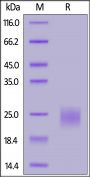 This protein carries a polyhistidine tag at the C-terminus. The protein has a calculated MW of 15.4 kDa. The protein migrates as 20-25 kDa under reducing (R) condition (SDS-PAGE) due to different extent glycosylation.