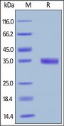 This protein carries a human IgG1 Fc tag at the N-terminus. The protein has a calculated MW of 32.5 kDa. The protein migrates as 35 kDa under reducing (R) condition (SDS-PAGE) due to glycosylation.