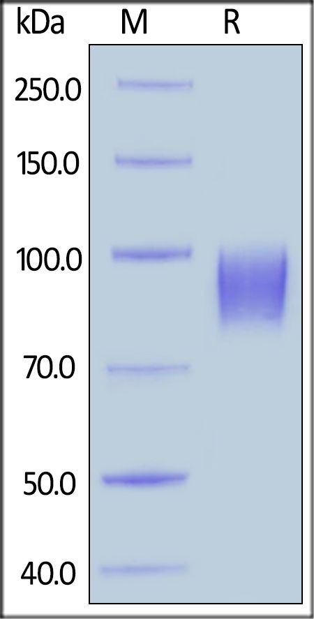 This protein carries a polyhistidine tag at the C-terminus. The protein has a calculated MW of 70.5 kDa. The protein migrates as 80-100 kDa under reducing (R) condition (SDS-PAGE) due to glycosylation.