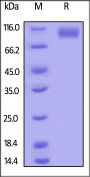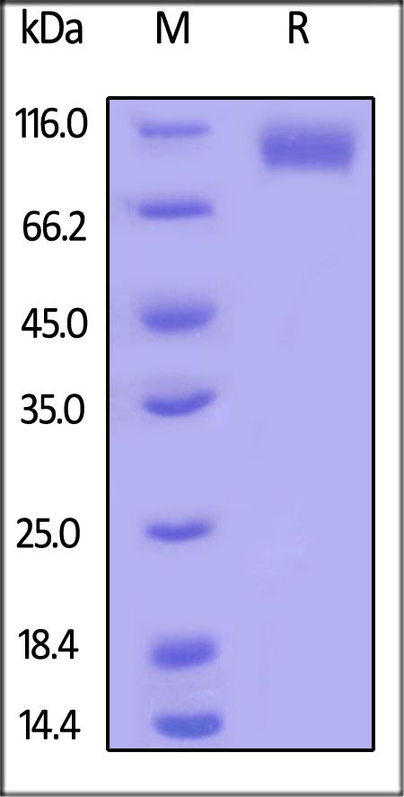 This protein carries a polyhistidine tag at the C-terminus. The protein has a calculated MW of 70.5 kDa. The protein migrates as 95-110 kDa when calibrated against Star Ribbon Pre-stained Protein Marker under reducing (R) condition (SDS-PAGE) due to glycosylation.