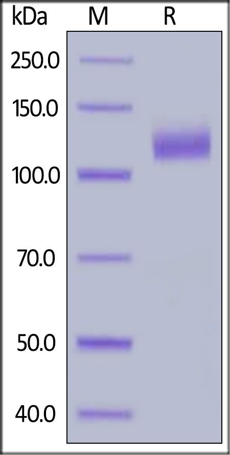 This protein carries a human IgG1 Fc tag at the C-terminus. The protein has a calculated MW of 94.7 kDa. The protein migrates as 110-140 kDa when calibrated against Star Ribbon Pre-stained Protein Marker under reducing (R) condition (SDS-PAGE) due to glycosylation.
