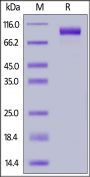 This protein carries a polyhistidine tag at the C-terminus. The protein has a calculated MW of 70.5 kDa. The protein migrates as 85-105 kDa under reducing (R) condition (SDS-PAGE) due to glycosylation.