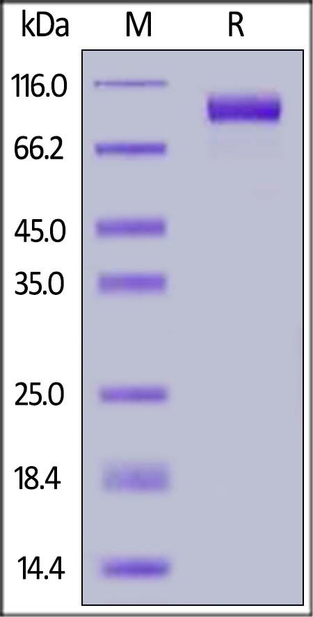This protein carries a polyhistidine tag at the C-terminus. The protein has a calculated MW of 70.5 kDa. The protein migrates as 85-105 kDa under reducing (R) condition (SDS-PAGE) due to glycosylation.