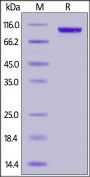 This protein carries a polyhistidine tag at the N-terminus. The protein has a calculated MW of 94.5 kDa. The protein migrates as 90-100 kDa under reducing (R) condition (SDS-PAGE).