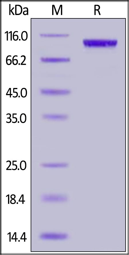 This protein carries a polyhistidine tag at the N-terminus. The protein has a calculated MW of 94.5 kDa. The protein migrates as 90-100 kDa under reducing (R) condition (SDS-PAGE).