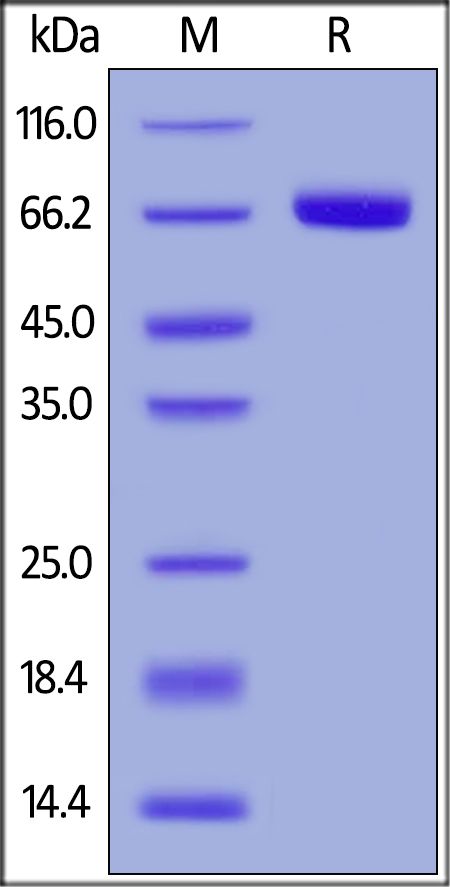 This protein carries a polyhistidine tag at the C-terminus. The protein has a calculated MW of 57.9 kDa. The protein migrates as 65-75 kDa under reducing (R) condition (SDS-PAGE) due to glycosylation.