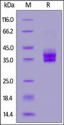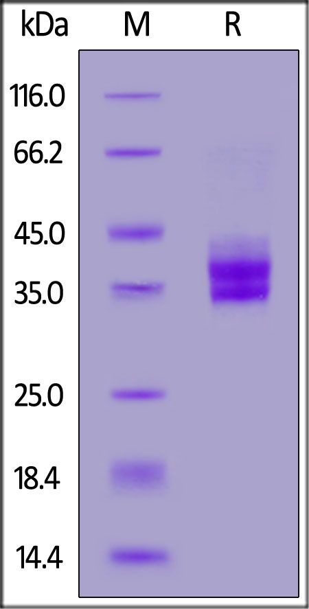 This protein carries a polyhistidine tag at the C-terminus. The protein has a calculated MW of 28.2 kDa. The protein migrates as 31-40 kDa when calibrated against Star Ribbon Pre-stained Protein Marker under reducing (R) condition (SDS-PAGE) due to glycosylation.