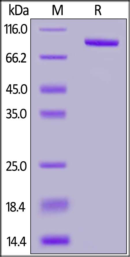 This protein carries a polyhistidine tag at the N-terminus. The protein has a calculated MW of 86.9 kDa. The protein migrates as 95 kDa when calibrated against Star Ribbon Pre-stained Protein Marker under reducing (R) condition (SDS-PAGE) due to glycosylation.