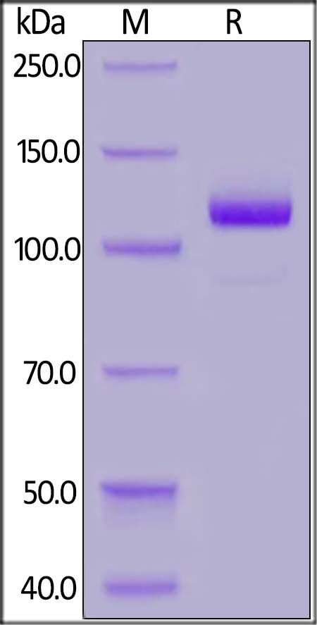 This protein carries a human IgG1 Fc tag at the N-terminus. The protein has a calculated MW of 111.5 kDa. The protein migrates as 120-130 kDa when calibrated against Star Ribbon Pre-stained Protein Marker under reducing (R) condition (SDS-PAGE) due to glycosylation.