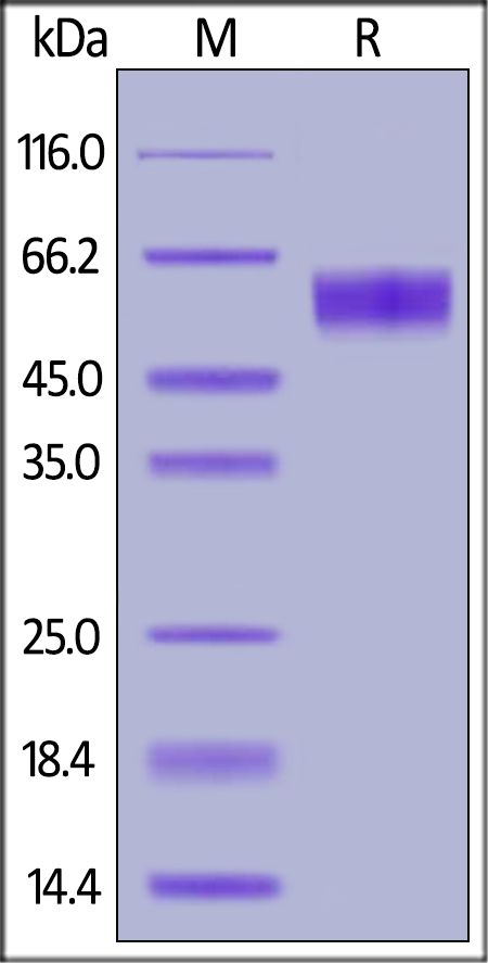 This protein carries a human IgG1 Fc tag at the C-terminus. The protein has a calculated MW of 42.8 kDa. The protein migrates as 50-66 kDa under reducing (R) condition (SDS-PAGE) due to glycosylation.